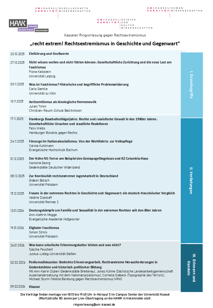 Im Wintersemester 2025/26 findet erneut die Kasseler Ringvorlesung gegen Rechtsextremismus statt. In Gedenken an den rassistischen Mord an Halit Yozgat, welchen der rechtsextreme NSU 2006 unweit des Campus Holländischer Platz begangen hat, finden seit 2012 jährlich Lehrveranstaltungen mit wechselnden Themen statt, die sich gleichermaßen an Studierende und Stadtgesellschaft richten. Ein interdisziplinäres Team der Fachbereiche Humanwissenschaften, Geistes- und Kulturwissenschaften sowie Gesellschaftswissenschaften organisiert die Ringvorlesung mit Wissenenschaftler:innen und Praktiker:innen. Im Wintersemester 2025/26 stehen die Einzelvorträge unter der Überschrift „recht extrem! Rechtsextremismus in Geschichte und Gegenwart“.