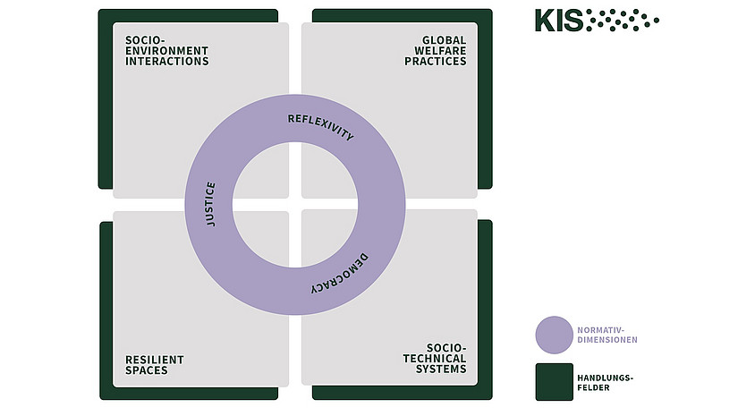 Derzeit orientieren wir uns an insgesamt sieben Forschungsschwerpunkte, d.h. vier Handlungsfelder und drei darauf bezogene Normativdimensionen. Den Forschungsdimensionen werden einzelne Themenfelder (wie zum Beispiel Rohstoffe, Intersektionalität, Internationale Politische Ökonomie, Decent Work usw.) zugeordnet. Hierbei unterscheiden wir zwischen bereits existierenden Projekten und Future Labs (als Projekten im Werden).