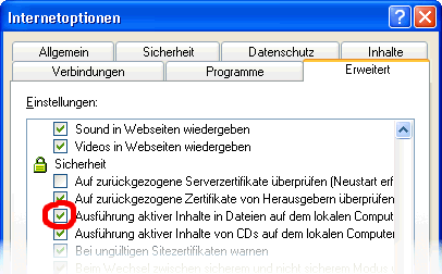 Wenn Sie den Internet Explorer auf einem Windows XP System mit Service Pack 2 verwenden und das Web-Dokument sich lokal auf Ihrer Festplatte befindet, dann verbietet der Internet Explorer in einer Standard-Voreinstellung die Ausführung von JavaScript auf lokalen Web-Seiten. Um in diesem Fall JavaScript zu aktivieren, öffnen Sie im Menü "Extras" den Eintrag "Internetoptionen" und aktivieren Sie unter "Erweitert" die Option "Ausführung aktiver Inhalte in Dateien auf dem lokalen Computer zulassen":