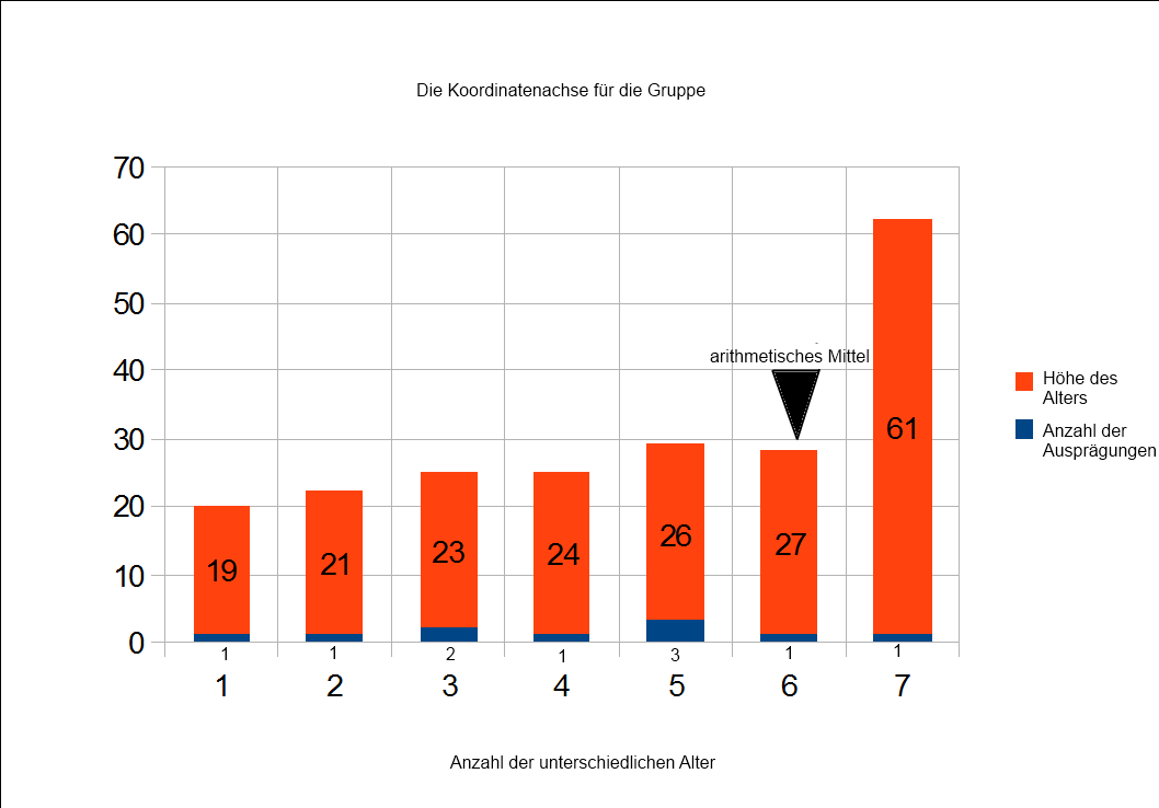 Der Modus ist das Männlein mit dem alter 24. Doch was würde passieren, wenn das 61 Jährige Männlein nicht zur Gruppe dazugebören würde? Finden Sie es herraus, indem Sie auf es klicken.