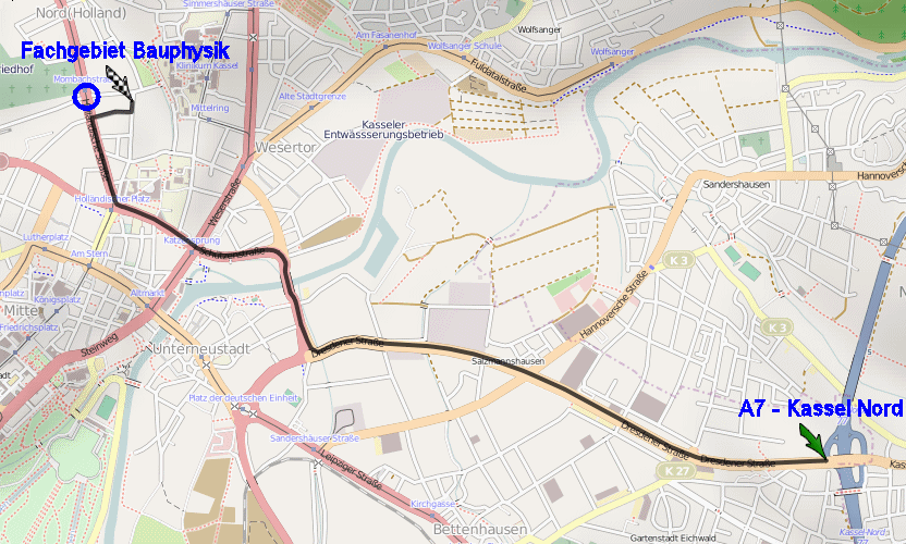 Taktzeit wochentags tagsüber 7 Minuten. Für Autofahrer ist auf der obenstehenden Karte der Weg von der A7 Hannover-Frankfurt/Würzburg, Abfahrt Kassel-Nord eingezeichnet (Schwarze Linie). Parkmöglichkeit besteht begrenzt in der Gottschalkstraße bzw. in den angrenzenden Querstraßen (Mombachstr. bzw. Westring). Die GPS-Koordinaten lauten: UTM 0535168 / 5686168 bzw. Gauß-Krüger 3535255 / 5688007 bzw. 51°19'33" N / 9°30'17". |
