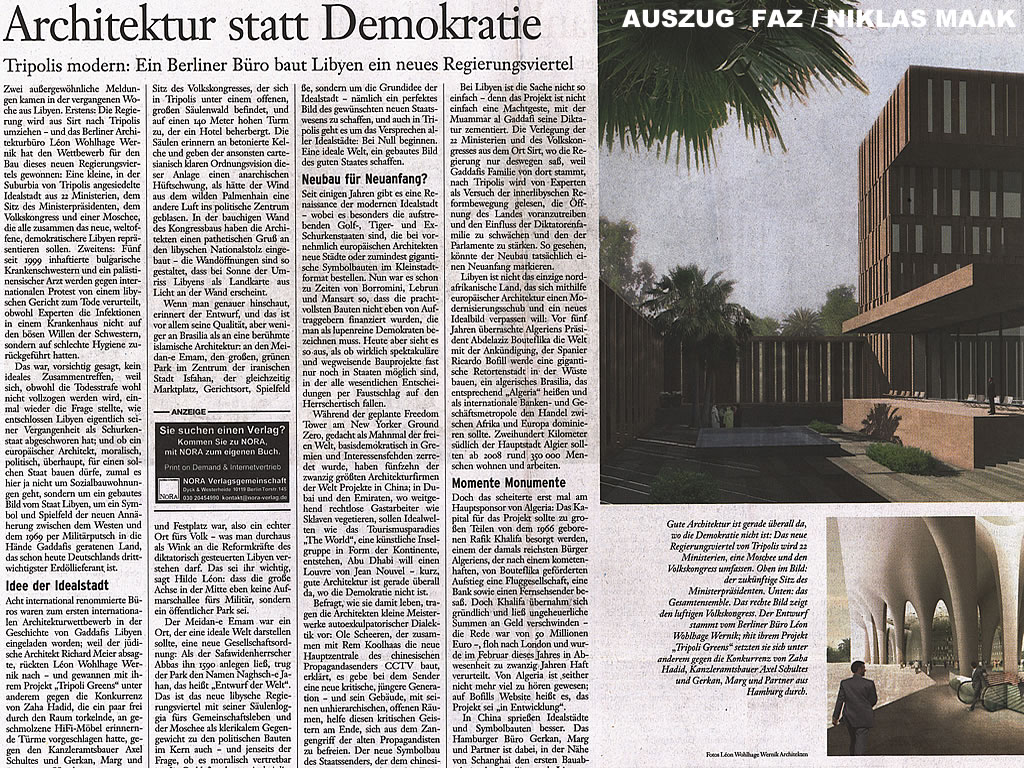 Niklas Maak kommentiert in der Frankfurter Allgemeine Sonntagszeitung mit der Überschrift: „Architektur statt Demokratie“ den städtebaulichen Siegerentwurf aus dem Wettbewerb für das neue Regierungsviertel in Tripolis, Libyen von Leon, Wohlhage, Wernik aus Berlin: “Gute Architektur ist gerade überall da, wo die Demokratie nicht ist...“.