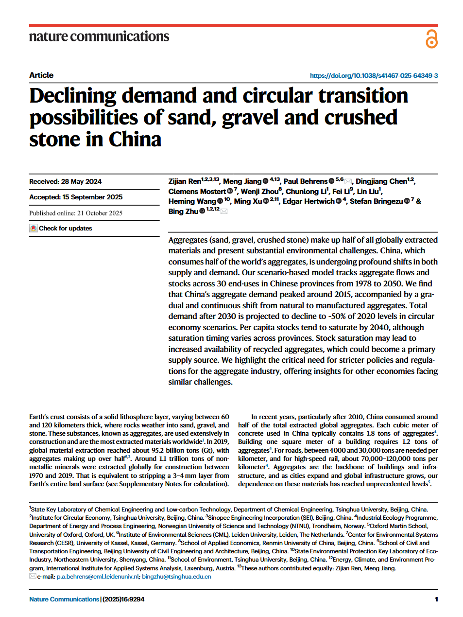 Aggregates (sand, gravel, crushed stone) make up half of all globally extracted materials and present substantial environmental challenges. China, which consumes half of the world’s aggregates, is undergoing profound shifts in both supply and demand. Our scenario-based model tracks aggregate flows and stocks across 30 end-uses in Chinese provinces from 1978 to 2050. We find that China’s aggregate demand peaked around 2015, accompanied by a gradual and continuous shift from natural to manufactured aggregates. Total demand after 2030 is projected to decline to ~50% of 2020 levels in circular economy scenarios. Per capita stocks tend to saturate by 2040, although saturation timing varies across provinces. Stock saturation may lead to increased availability of recycled aggregates, which could become a primary supply source. We highlight the critical need for stricter policies and regulations for the aggregate industry, offering insights for other economies facing similar challenges.