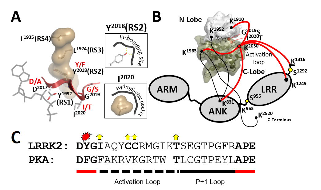 Abbildung 2. Der Zusammenbau der R-Wirbelsäule muss streng reguliert werden, um die Konformation des DYGψ Motivs und damit die ON- und OFF-Zustände der Kinase zu kontrollieren. Pathogene Mutationen in diesem Motiv (d.h. G2019S [DYGψ] und I2020T [DYGψ]) verändern die Kinase-Regulation und werden zu einer treibenden Kraft für die Parkinson-Krankheit. Mit Y2018F (RS2/ DYGψ) beschreiben wir eine Mutation, die den Merkmalen von G2019S und I2020T ähnelt.