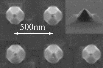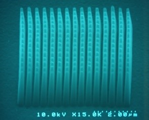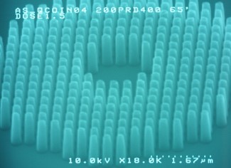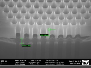 Darüber hinaus wurden photonische Kristalle in nanokristallinen Diamantmembranen (NCD) aus Filmen hergestellt, die auf Si-Wafern abgeschieden wurden, welche mit einer Opferschicht aus SiO2 beschichtet waren. Das Design beinhaltete Luftlöcher mit einem Durchmesser von 230 nm und einer Periode von 300 nm (Abb. 2 (a)). Die Herstellung der photonischen Kristalle umfasst ihre Definition durch EBL und RIE mit O2-Plasma, gefolgt von nasschemischem Ätzen der SO2-Opferschicht. Die erhaltenen photonischen Strukturen besaßen Löcher mit senkrechten und glatten Wänden (Abb. 2 (b)). Die Herstellung und Untersuchung diverser photonischer Diamantstrukturen wird derzeit vom Bundesministerium für Bildung und Forschung (BMBF) finanziell gefördert.