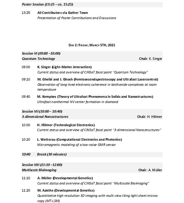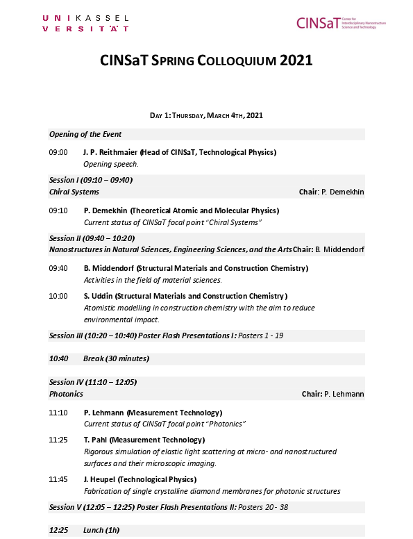 The annual CINSaT Spring Colloquium will take place from Thursday 4 to Friday 5 March 2021 (see program below, access data can be requested by mail to info[at]cinsat.uni-kassel[dot]de). All CINSaT members, their staff and members of the Scientific Advisory Board are cordially invited to the Spring Colloquium. The colloquium will feature a lecture session as well as an extensive poster session presenting current research highlights that have emerged within the CINSaT focal points.
