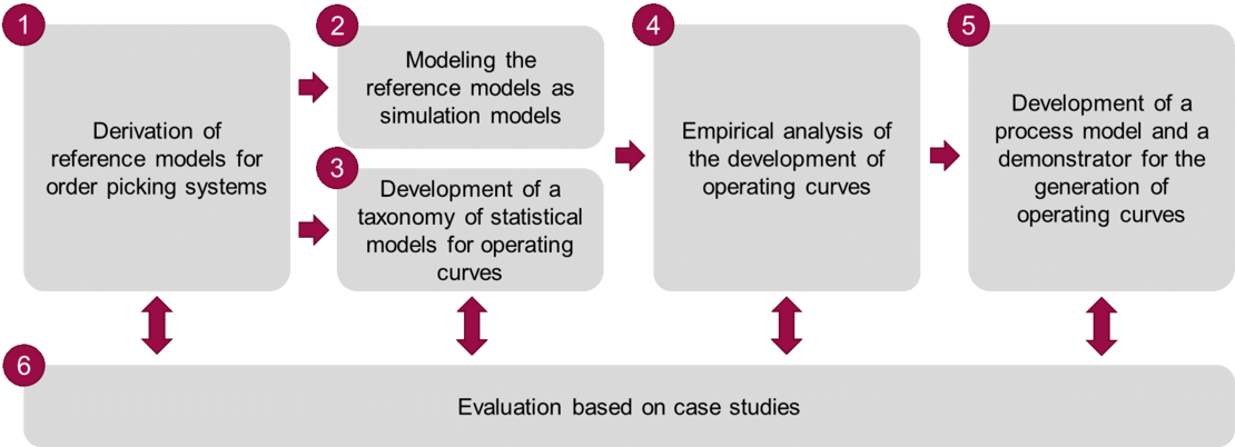 Consequently, a procedural model for generating operating curves has been formulated. Furthermore, a demonstrator has been developed for the practical application of the methodology that has been developed (5). Finally, a case study-based evaluation of the methodology and an analysis of its applicability in various planning tasks over the life cycle of order picking systems is carried out (6).