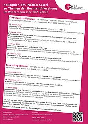 Sieben Vorträge geben interessante und vielschichtige Einsichten in den Themenkomplex „Wissenschaft, Hochschule und Gesellschaft“, wobei neben externen Gästen auch Vortragende aus dem INCHER in unserem „brown bag“-Format vortragen.