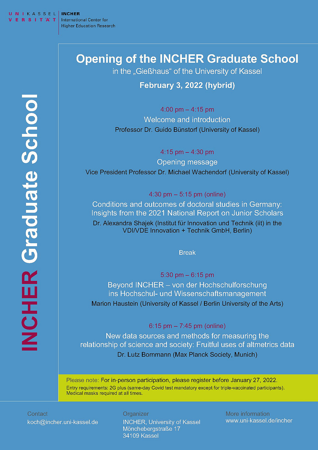 The "festive opening" of the INCHER Graduate School took place at the University of Kassel on February 3, 2022. Professor Dr. Guido Bünstorf (University of Kassel/INCHER) who moderated the event highlighted mentorship, an early career publication award and certification as special characteristics of the programme. He said: "The Graduate School is still a promise - let's turn it into a success story".