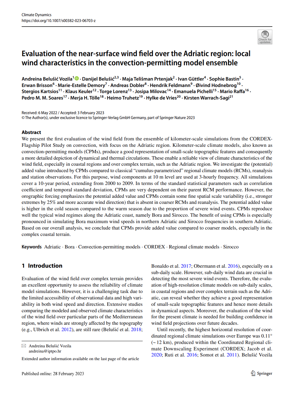 We present the first evaluation of the wind field from the ensemble of kilometer-scale simulations from the CORDEX-Flagship Pilot Study on convection, with focus on the Adriatic region. Kilometer-scale climate models, also known as convection-permitting models (CPMs), produce a good representation of small-scale topographic features and consequently a more detailed depiction of dynamical and thermal circulations. These enable a reliable view of climate characteristics of the wind field, especially in coastal regions and over complex terrain, such as the Adriatic region. We investigate the (potential) added value introduced by CPMs compared to classical “cumulus-parametrized” regional climate models (RCMs), reanalysis and station observations. For this purpose, wind components at 10 m level are used at 3-hourly frequency. All simulations cover a 10-year period, extending from 2000 to 2009. In terms of the standard statistical parameters such as correlation coefficient and temporal standard deviation, CPMs are very dependent on their parent RCM performance. However, the orographic forcing emphasizes the potential added value and CPMs contain some fine spatial scale variability (i.e., stronger extremes by 25% and more accurate wind direction) that is absent in coarser RCMs and reanalysis. The potential added value is higher in the cold season compared to the warm season due to the proportion of severe wind events. CPMs reproduce well the typical wind regimes along the Adriatic coast, namely Bora and Sirocco. The benefit of using CPMs is especially pronounced in simulating Bora maximum wind speeds in northern Adriatic and Sirocco frequencies in southern Adriatic. Based on our overall analysis, we conclude that CPMs provide added value compared to coarser models, especially in the complex coastal terrain.