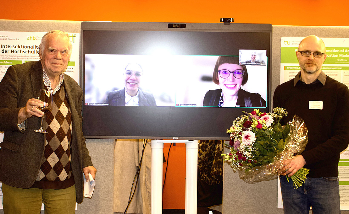 Der Stifter des Preises, Prof. Dr. Ulrich Teichler, mit dem Preisträger Gunther Dahm (virtuell anwesend. Sabine Freudhofmeyer und Zoe Maldonado)