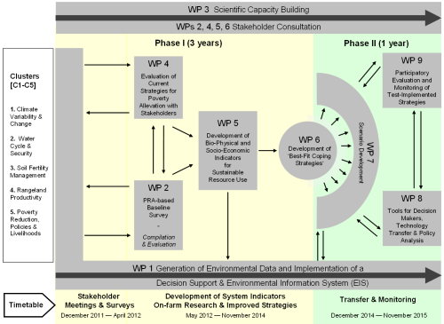 Mongolian, Chinese and German scientists team up in five different thematic Clusters each contributing to nine Work Packages. This graph represents the Watercope's R&D approach and its approximate time frame.
