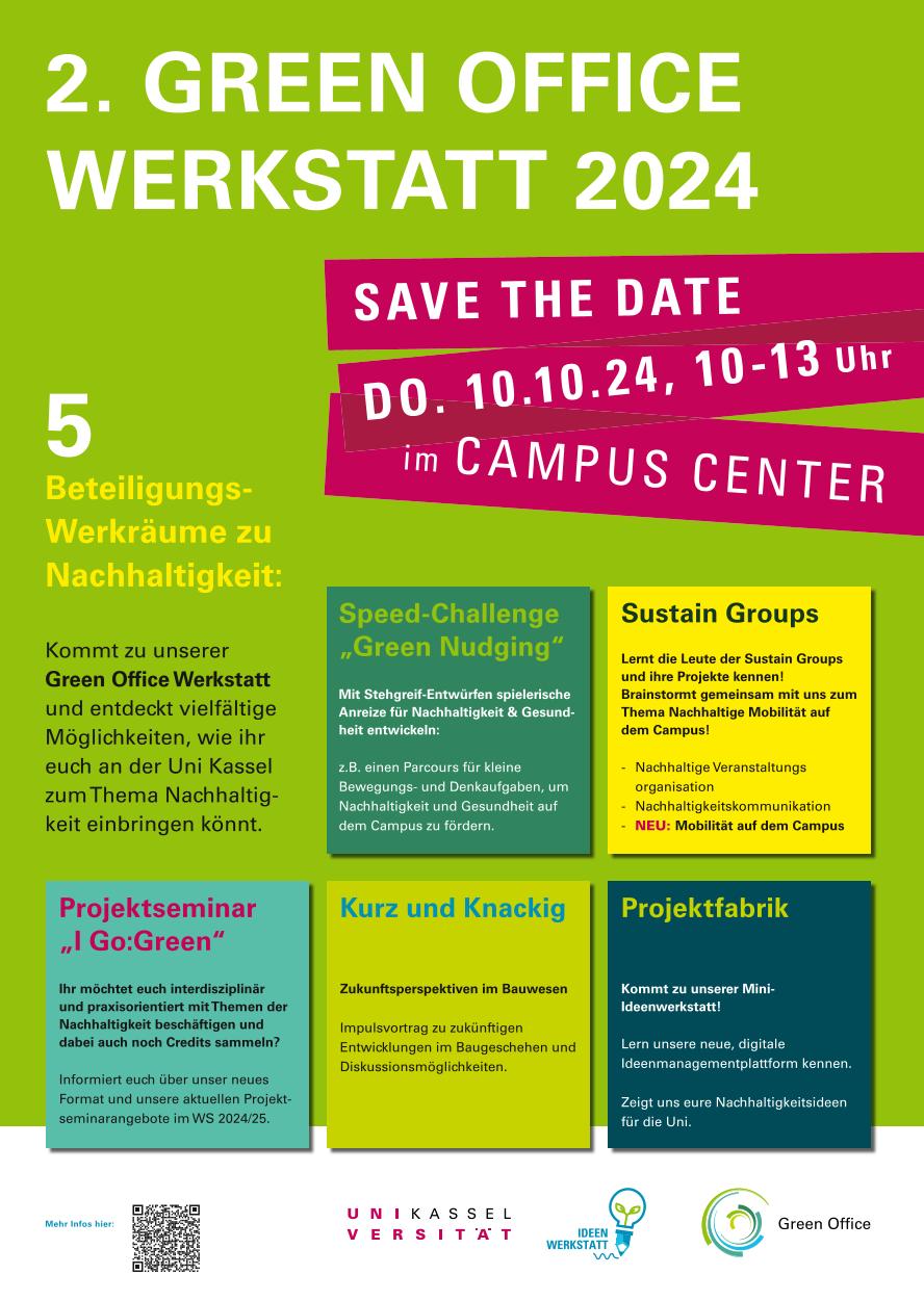 Ihr seid herzlich eingeladen, an der 2. Green Office Werkstatt am Donnerstag, den 10.10.2024, von 10:00-13:00 Uhr im Campus Center der Universität Kassel teilzunehmen.
