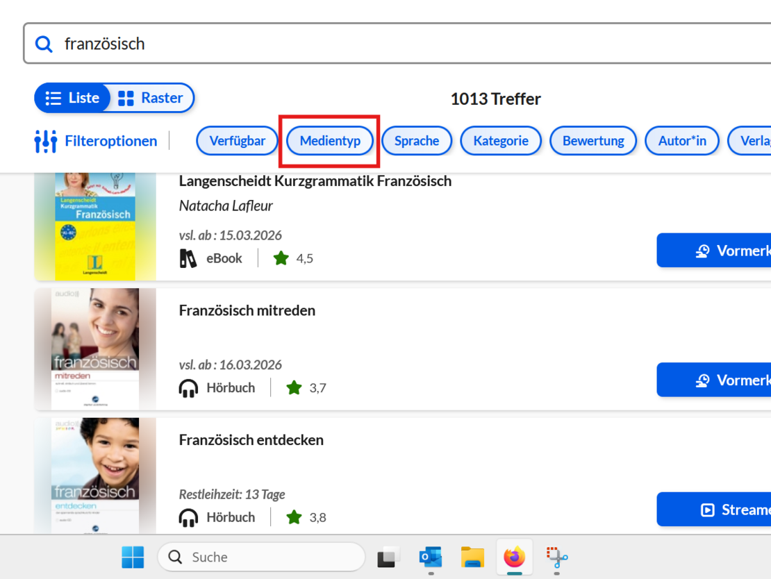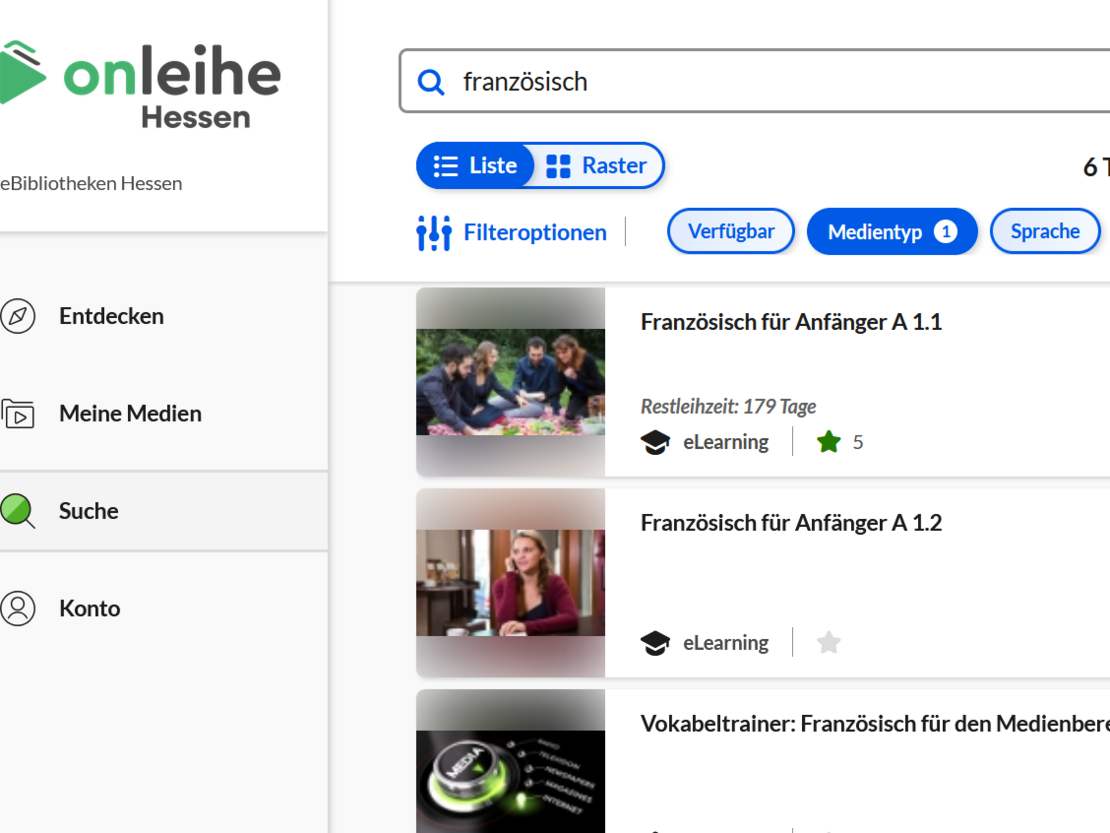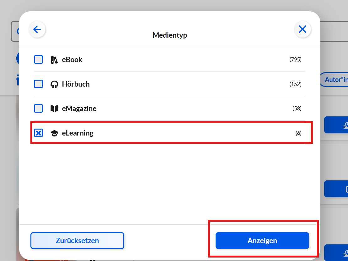 7. Under the filters, select the category “eLearning” in “Medientyp” to display relevant courses.