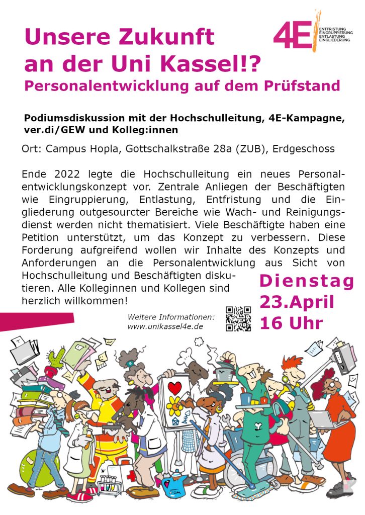 Ende 2022 legte die Hochschulleitung ein neues Personalentwicklungskonzept vor. Zentrale Anliegen der Beschäftigten wie Eingruppierung, Entlastung, Entfristung und die Eingliederung outgesourcter Bereiche wie Wach- und Reinigungsdienst werden nicht thematisiert. Viele Beschäftigte haben eine Petition unterstützt, um das Konzept zu verbessern. Diese Forderung aufgreifend wollen wir Inhalte des Konzepts und Anforderungen an die Personalentwicklung aus Sicht von Hochschulleitung und Beschäftigten diskutieren. Alle Kolleginnen und Kollegen sind herzlich willkommen!