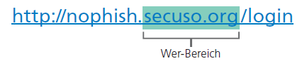 Der Wer-Bereich einer Webadresse besteht aus den beiden Begriffen, die durch einen Punkt getrennt sind und sich vor dem ersten alleinstehenden Schrägstrich „/“ befinden (siehe Bild). Der Wer-Bereich ist der wichtigste Bereich, d. h. der wichtigste Indikator für die Erkennung gefährlicher Webadressen und damit von Nachrichten mit gefährlichen Links. In der Fachsprache wird er „Domain“ genannt. Falls hier Zahlen stehen, handelt es sich um eine sogenannte IP-Adresse und es ist höchstwahrscheinlich eine gefährliche Webadresse.