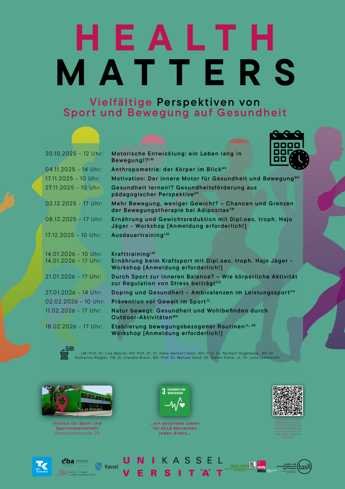 Die neue Veranstaltungsreihe „Health Matters – Vielfältige Perspektiven von Sport und Bewegung auf Gesundheit“ lädt im Wintersemester regelmäßig in die Damaschkestraße 25 ein. Spannende Vorträge – von Ausdauertraining bis Prävention von Gewalt im Sport – sowie Workshops zu Ernährung und gesunden Routinen zeigen, wie vielfältig Gesundheit gedacht werden kann.