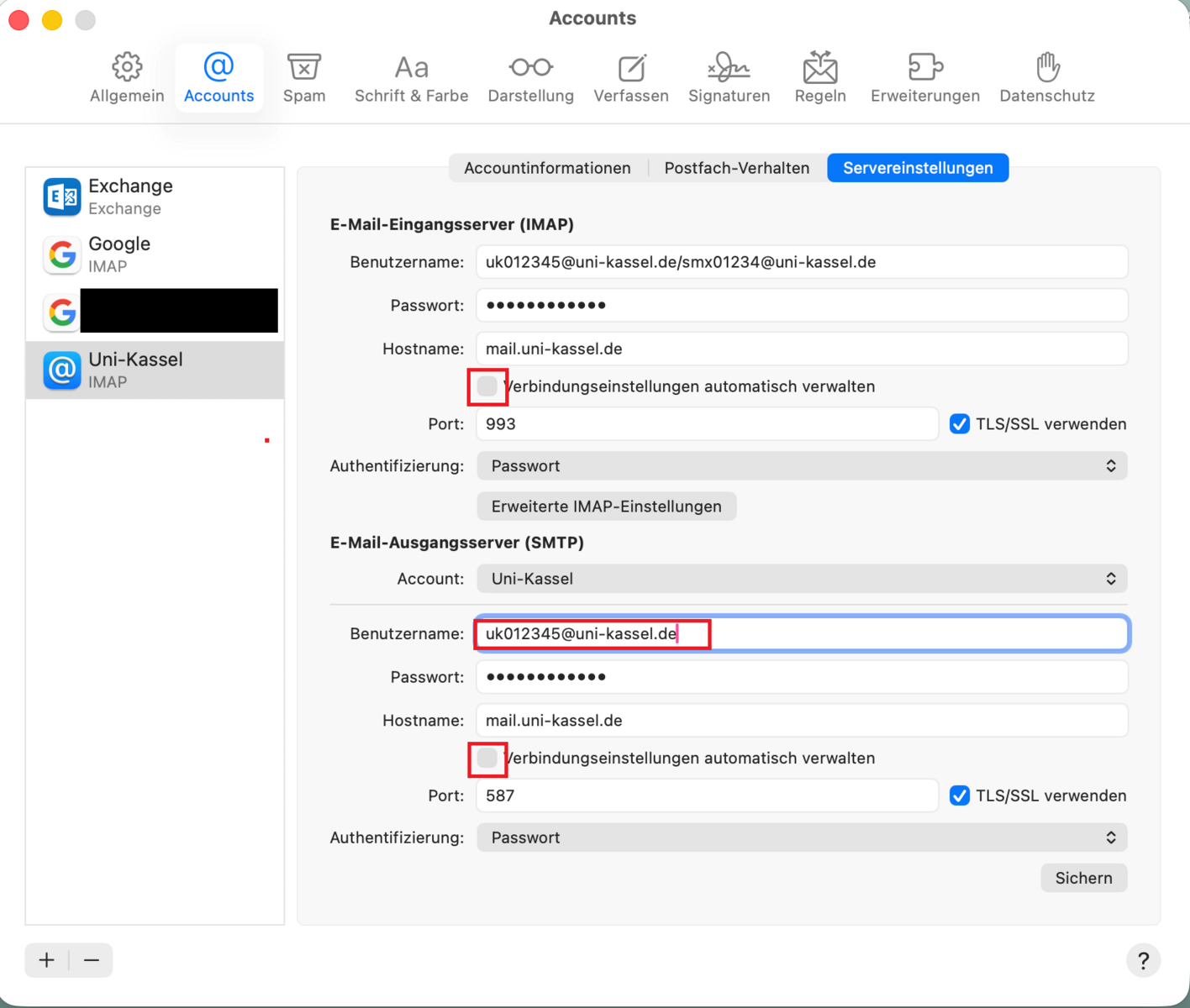 In the next step, you will be asked to enter your user name. First enter your user name under the domain @uni-kassel.de, followed by a slash and then the mailbox name (not the clear name mail address!), followed by the domain <uk012345@uni-kassel.de/smx012345@uni-kassel.de>.