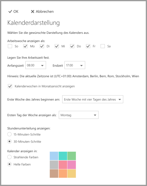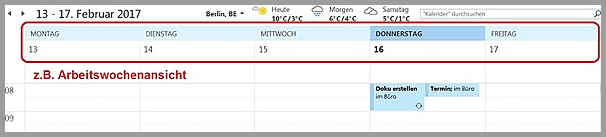- Show working week as: Here you can select how many days your working week has, in the calendar view "Working week" only these days are then displayed and e.g. the weekend is hidden.