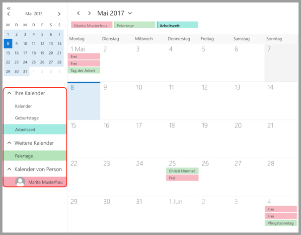 You have the option of selecting which of your calendars should be displayed at the same time by clicking on the desired calendar in the left-hand sidebar. Calendars that are displayed are highlighted in color in the sidebar. If you want to hide a calendar, click on it again.