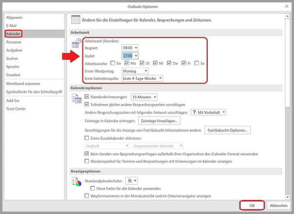 You can set your working hours and please proceed as follows. Go to the "File" tab and select "Options". You can set your working hours under the "Calendar" menu item. Finish the process with "OK".