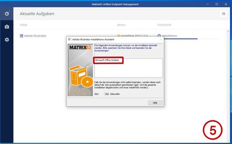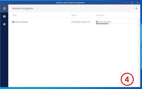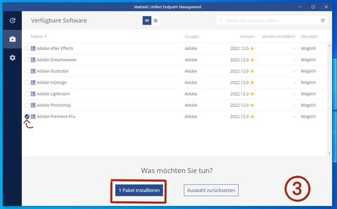 3. Im Anschluss öffnet sich ein Matrix42 Fenster, in dem Sie das gewünschte Programm auswählen können. Sobald Sie die gewünschten Programme ausgewählt haben, können Sie unten auf „Paket installieren“ klicken.
