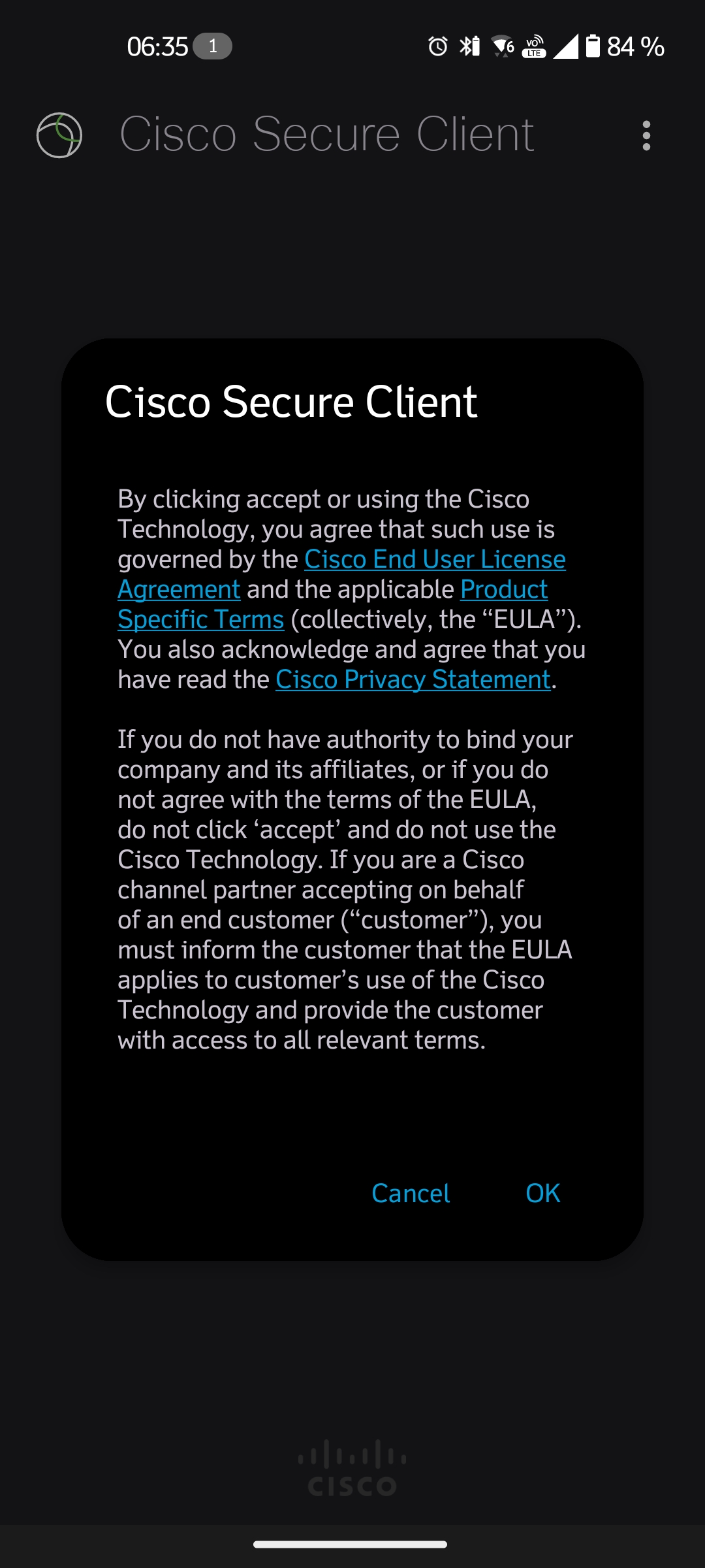 Zur Nutzung der App ist es notwendig, den Cisco End Endnutzer Lizenzbestimmungen zuzustimmen: