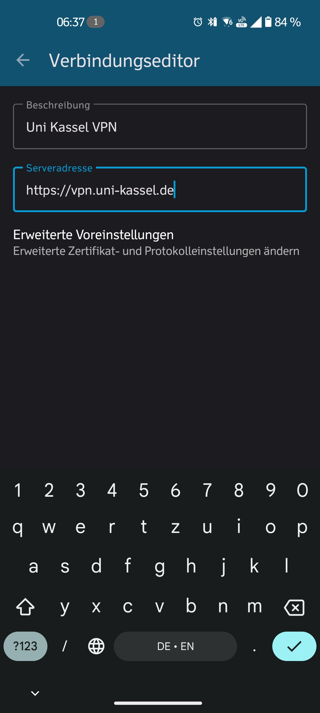 Tragen Sie nun die Serveradresse für das Uni Kassel VPN ein: