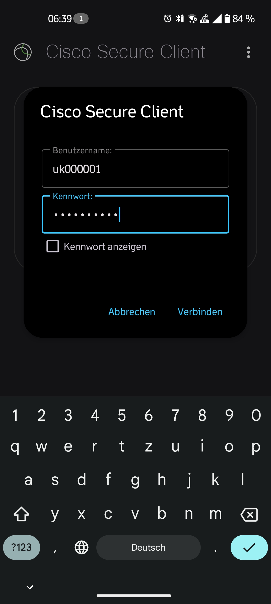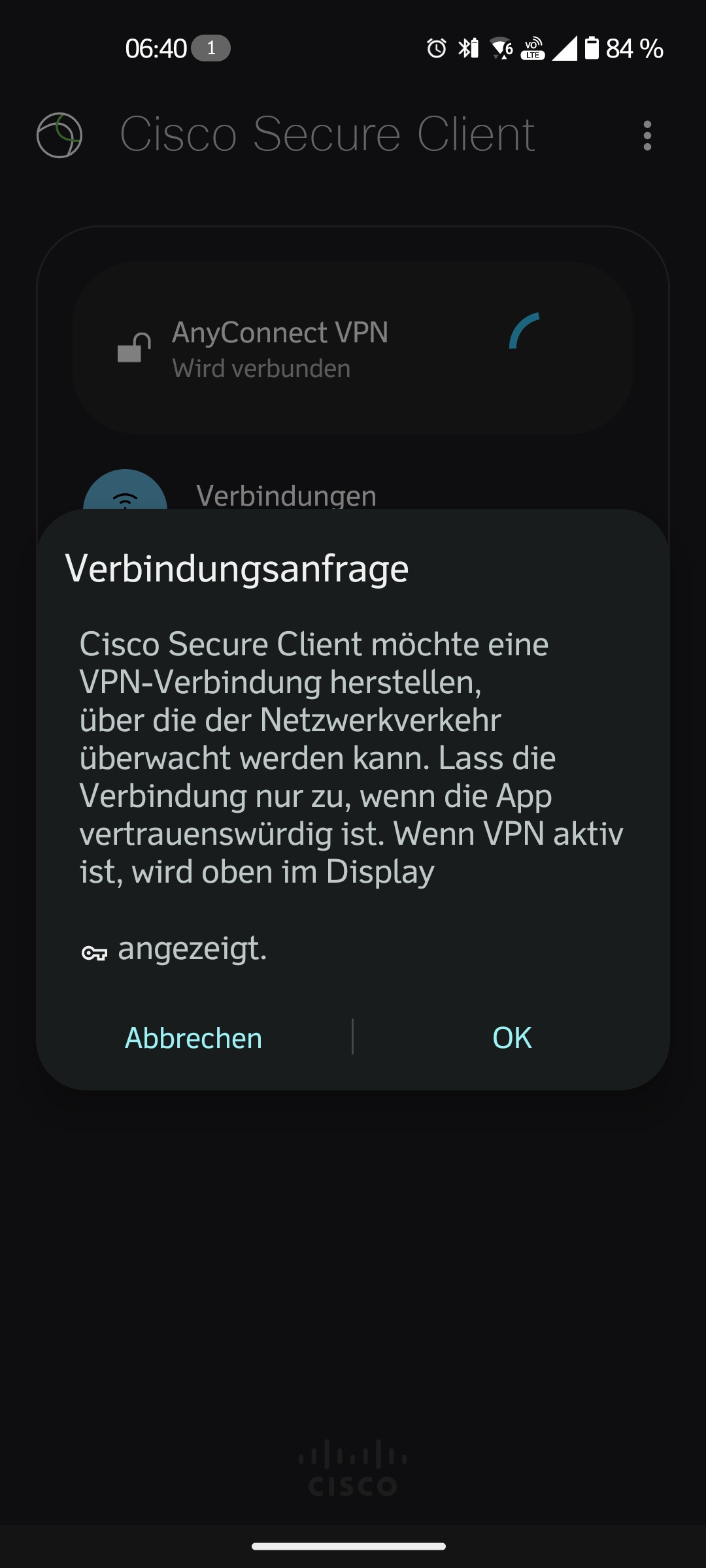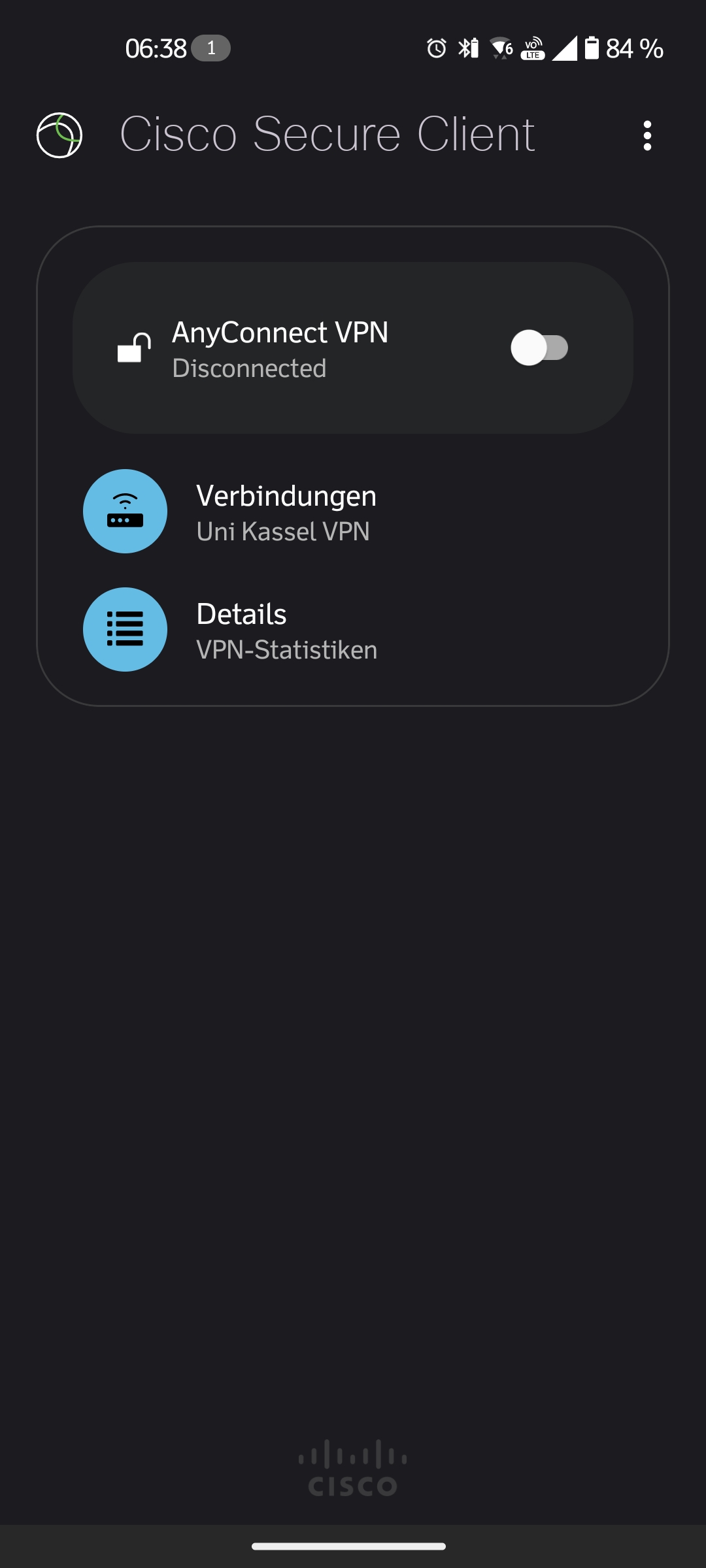 Um die Verbindung zu trennen betätigen Sie erneut die Schaltfläche "AnyConnect VPN - Verbunden" (Schiebeschalter).
