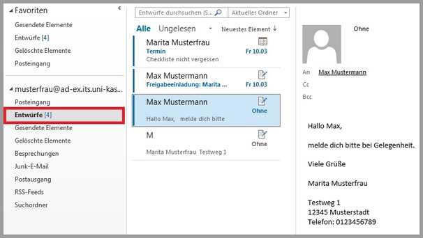 Die als Entwurf gespeicherten E-Mails finden Sie im Ordner "Entwurf" wieder. Hier können Sie die E-Mail im Lesebereich erneut bearbeiten oder diese mit einem Doppelklick in einem separaten Fenster öffnen.