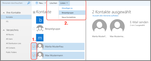 Wenn Sie Kontakte nachträglich einer Liste hinzufügen möchten oder Kontakte löschen wollen, wählen Sie diese in der Listenansicht aus, indem Sie einen Haken vor dem Kontakt setzen, anschließend können Sie die gewünschte Aktion in der oberen Menüleiste auswählen.