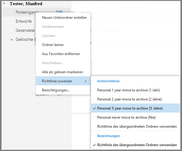 Sie können jedoch für jeden Ordner festlegen, welche Archivrichtlinie angewendet werden soll. Klicken Sie dazu mit der rechten Maustaste auf den gewünschten Ordner, beispielsweise "Posteingang", und wählen Sie "Richtlinie zuweisen". Anschließend können Sie die gewünschte Archivrichtlinie auswählen.