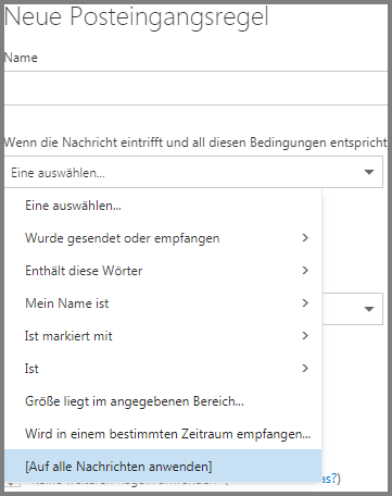 Geben Sie der neuen Regel zunächst einen beliebigen Namen. Danach wählen Sie „Auf alle Nachrichten anwenden“ aus, um alle Nachrichten weiterzuleiten.