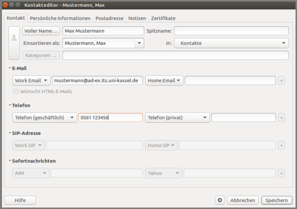 Geben Sie nun die Daten Ihres Kontaktes in die Entsprechenden Felder ein, beachten Sie, dass Sich im oberen Bereich des Fenstern Schaltflächen befinden, durch die Sie weitere Angaben machen können.