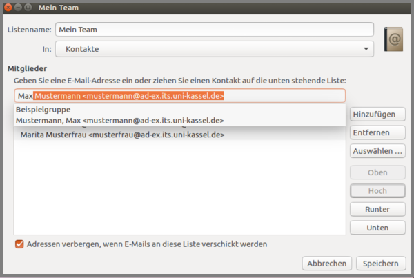 - Mitglieder: Hier geben Sie Namen aus Ihrem Adressbuch ein, sobald Sie anfangen zu tippen, werden Ihnen Vorschläge aus Ihren Adressbüchern gemacht.