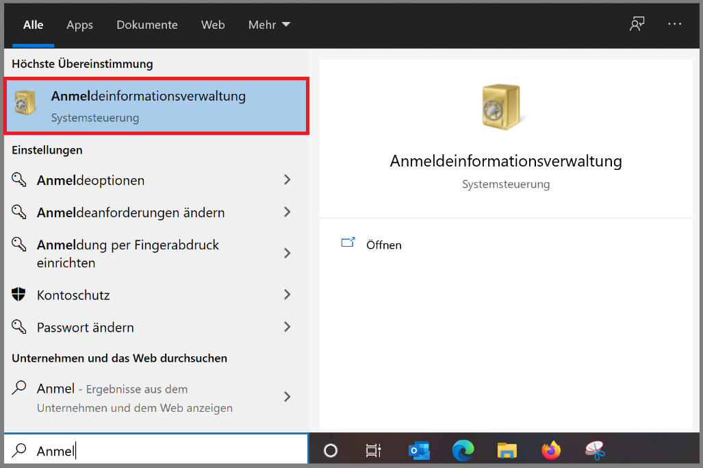 Rufen Sie zuerst die Anmeldeinformationsverwaltung. Geben Sie hierzu im Suchfeld der Taskleiste oder im Suchfeld der Windows Einstellungen als Begriff "Anmeldeinformationsverwaltung" ein.