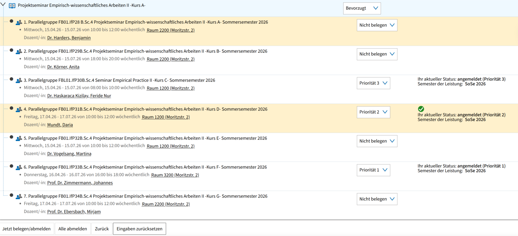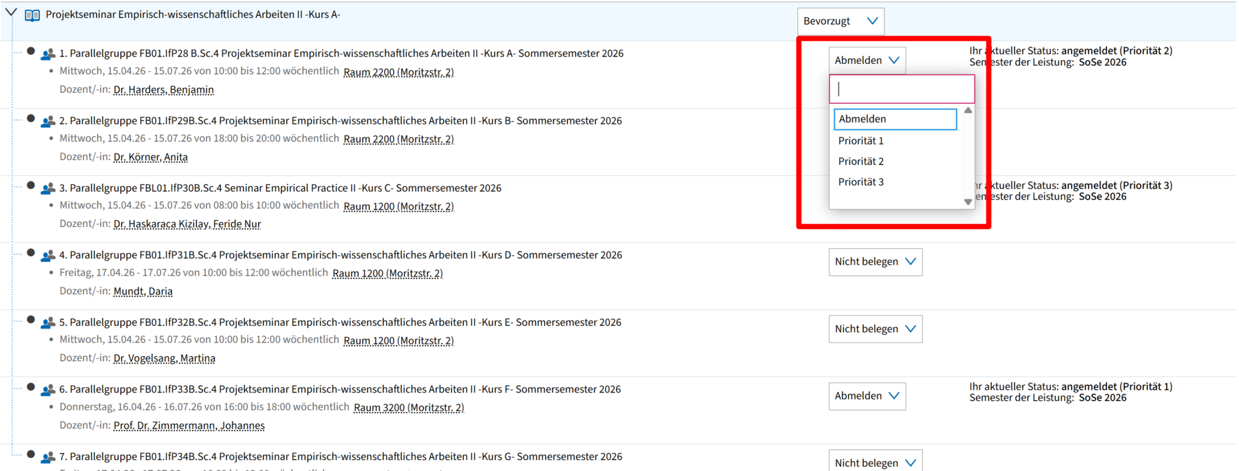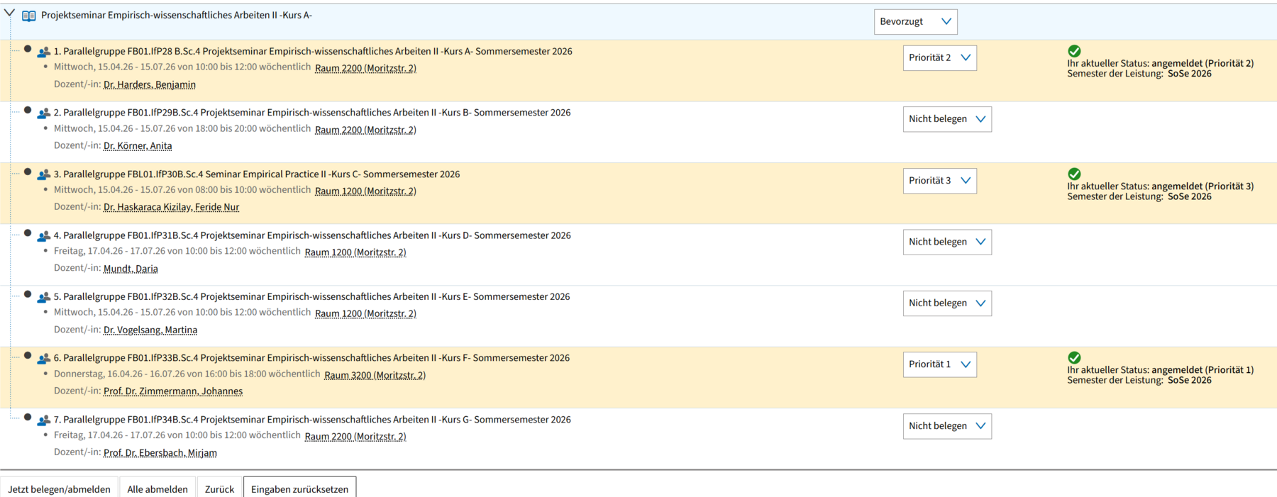 Nach erfolgreicher Übermittlung siehst du rechts neben den entsprechenden Parallelgruppen den Hinweis „Ihr aktueller Status: angemeldet (Priorität X) – Semester der Leistung: SoSe 2026".