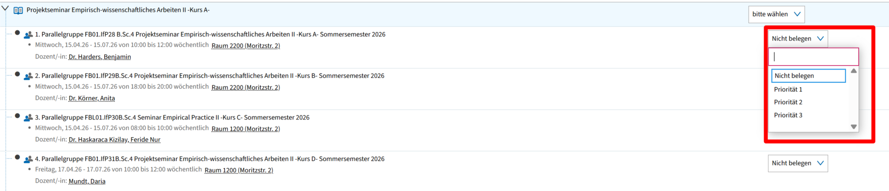 Neben jeder Parallelgruppe befindet sich ein Dropdown-Feld. Standardmäßig steht dort „Nicht belegen". Klicke auf das Dropdown-Feld neben der Parallelgruppe, die du belegen möchtest. Es öffnet sich ein Menü mit den Optionen „Nicht belegen", „Priorität 1", „Priorität 2" und „Priorität 3".