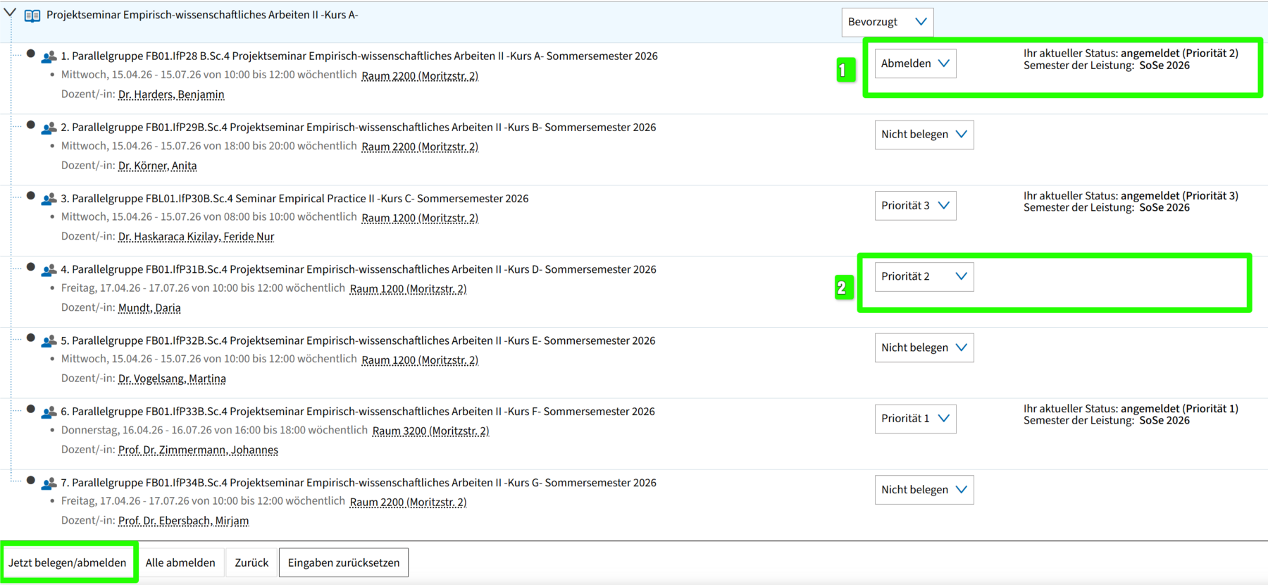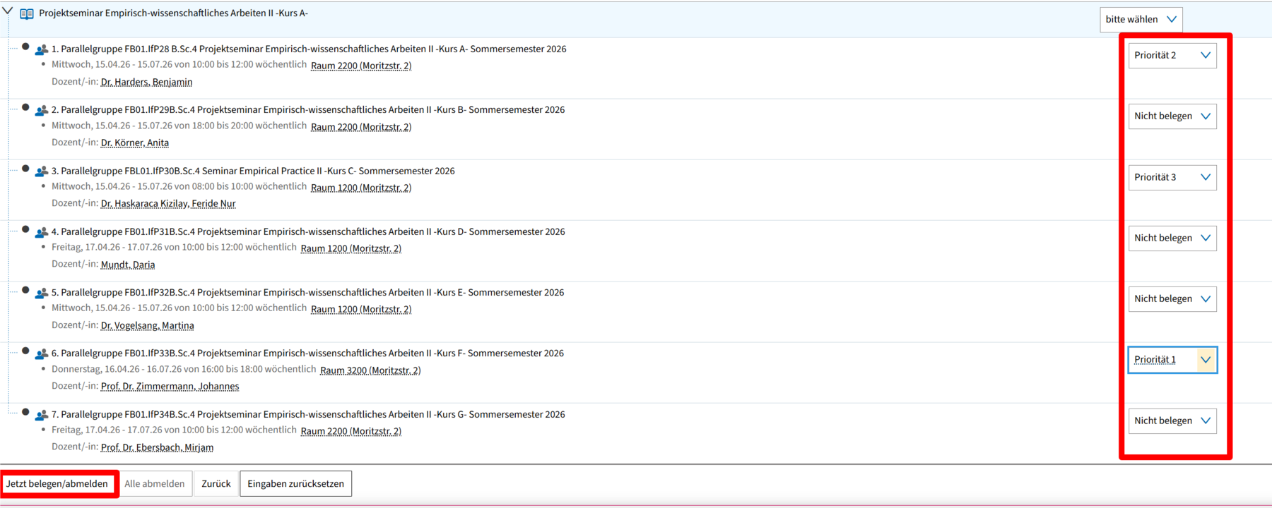 Wenn du alle deine gesetzten Prioritäten auf einmal löschen und von vorne beginnen möchtest, klicke unten auf den Button „Alle abmelden". Damit werden alle Dropdowns wieder auf „Nicht belegen" zurückgesetzt und du kannst neu beginnen, Prioritäten zu vergeben. Denke anschließend daran, deine neue Auswahl mit „Jetzt belegen/abmelden" zu speichern.