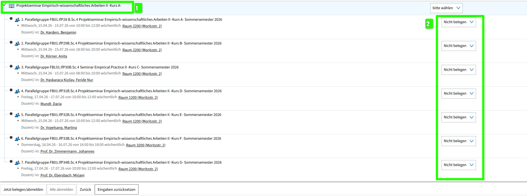 - Gruppen, die du nicht belegen möchtest, lässt du auf „Nicht belegen" stehen.
