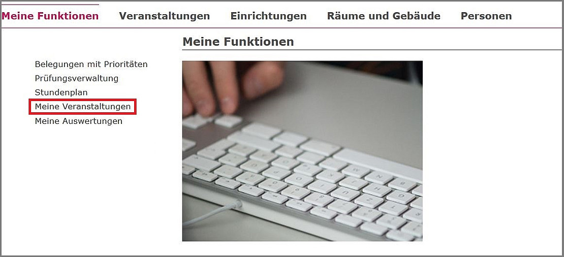 Klicken Sie auf "Meine Veranstaltungen". Es werden die Semester aufgelistet, in denen Belegungen von Ihnen gespeichert sind. (Für manche Verfahren werden Belegungen aus älteren Belegverfahren gelöscht.)