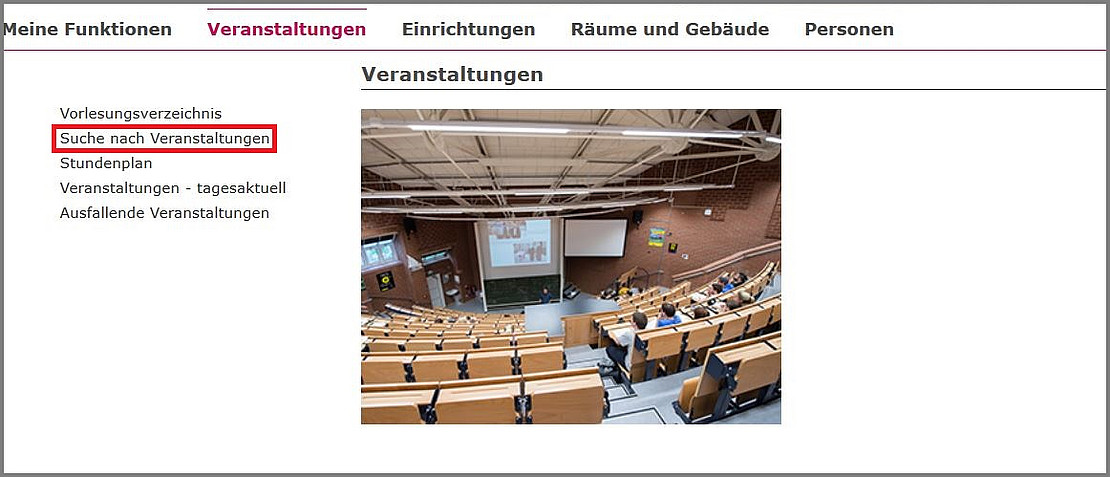 Diese Anleitung beschreibt eine "einfache" Belegung. Geht es um ein Belegungsverfahren mit Prioritäten, lesen Sie bitte diese Anleitung. Die Karteikarte "Veranstaltungen" bietet verschiedene Möglichkeiten, gewünschte Veranstaltungen zu finden.