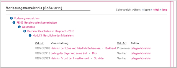 Im Vorlesungsverzeichnis kann man durch Klick auf die einzelnen Überschriften im Baum klettern und so die Veranstaltungen für einen bestimmten Studiengang finden.