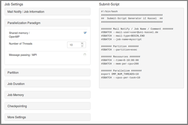 Mit dem Skript Generator ist es möglich, sich Submit-Skripte passend zum Linux Cluster Kassel generieren zu lassen. Sie können die Vorgabe dann durch das Laden von Modulen und das Starten Ihres Programms erweitern.