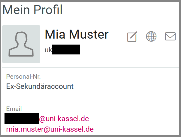 Klicken Sie auf "Mein Profil", können Sie Ihre Personalnummer (falls vorhanden) und die von Ihnen gesetzten E-Mail-Adressen einsehen.