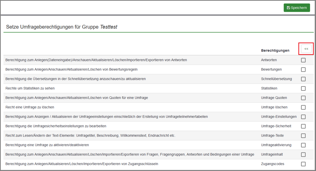 Haben Sie die Benutzergruppe hinzugefügt, können Sie anschließend die Berechtigungen für die Personen setzen, die an Ihrer Umfrage mitarbeiten sollen. Klicken Sie hierfür bitte auf "Setze Umfrage-Benutzerrechte".