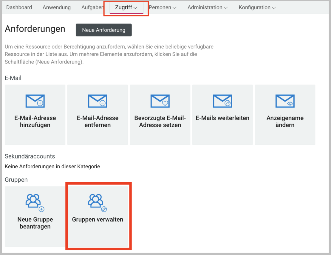 - Wählen Sie anschließend die Kachel "Gruppe verwalten" unter der Kategorie "Gruppen".
