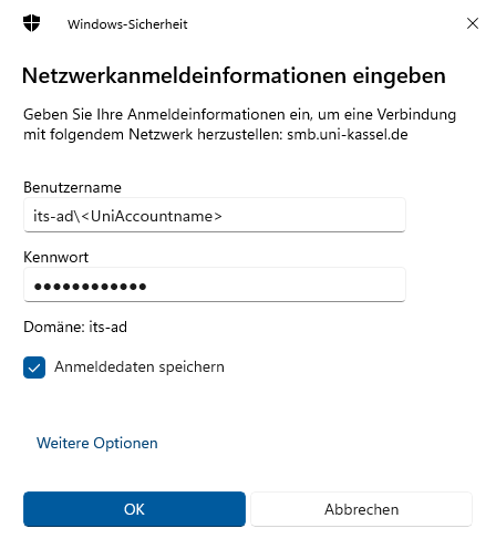 alternativ können Sie auch \\smb.uni-kassel.de\IhrUniAccount (z.B \\smb.uni-kassel.de\uk012345) eingeben.