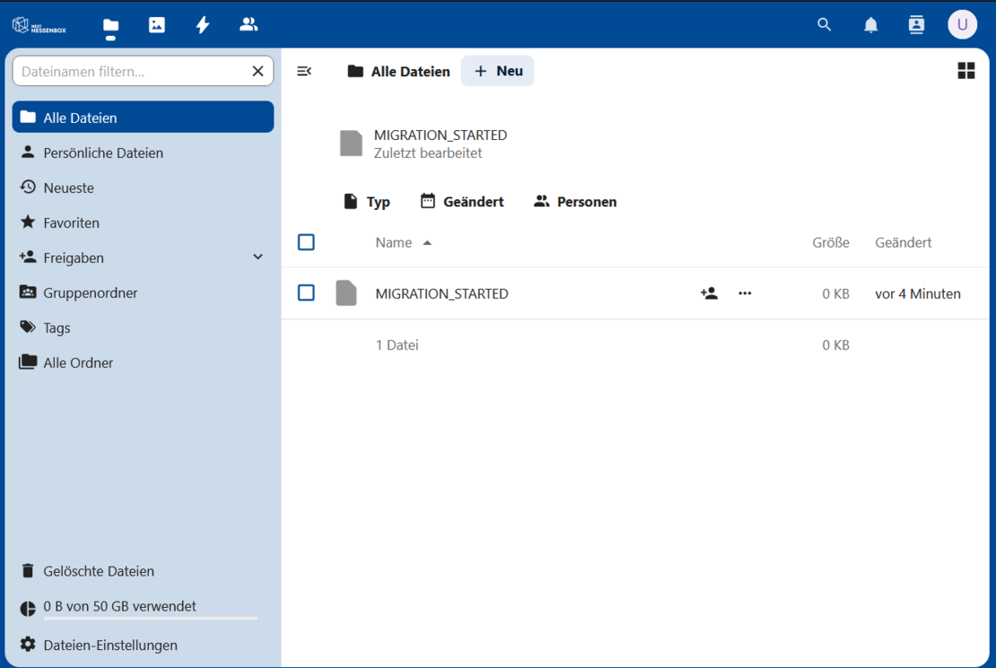 Erstellen Sie eine neue, leere Textdatei im Hauptordner (unter „Alle Dateien“) mit dem Namen MIGRATION_REQUESTED (alles in Großbuchstaben, ohne Endung wie „.docx“), indem Sie auf "+Neu" und anschließend auf "Neue Textdatei" klicken.