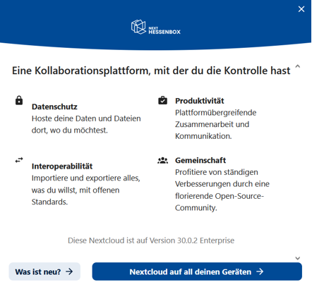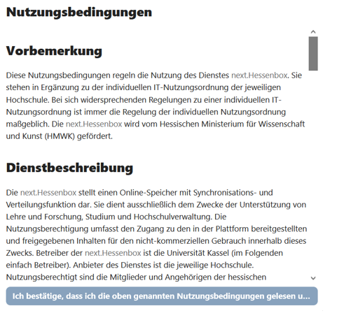 Akzeptieren Sie zuletzt die Nutzungsbedingungen, um fortzufahren. Ohne Bestätigung können Sie die next.hessenbox nicht nutzen.